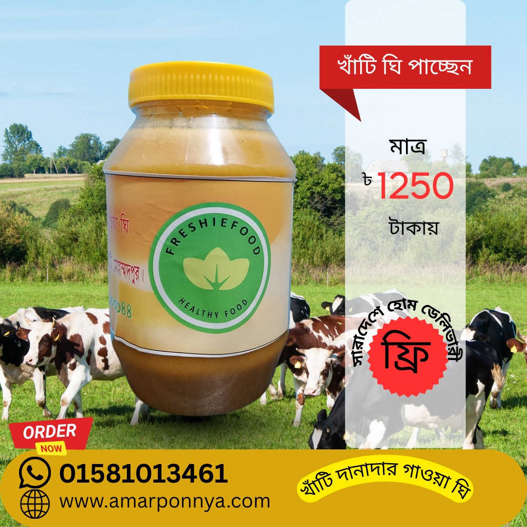 আমরা দিচ্ছি সিরাজগঞ্জের সর্বোৎকৃষ্ট খাঁটি গাওয়া ঘি যা গুনে, মানে ও স্বাদে অতুলনীয়। আসলে ঘি-এর মান নির্ভর করে ক্রিমের গুনগত মানের উপরে। আর ভালো ক্রিম পেতে হলে গরুকে খাওয়াতে হবে Balanced Diet. Roughage অর্থাৎ কাঁচা ঘাস ও Concentrate অর্থাৎ দানাদার খাদ্যের সমন্বয়ে তৈরী হয় গরুর Balance Diet। একটি গবেষণায় দেখা গেছে সিরাজগঞ্জের অঞ্চলের গরুর দুধের Fat রয়েছে 6.17%, যেখানে দেশের অন্যান্য অঞ্চলের দুধের এভারেজ Fat এর পরিমান 4.92%, অর্থাৎ আমাদের দুধের Fat এর পরিমাণ 25.40% বেশী। পাবনার দুধের গুণগত মান ভালো হওয়ার কারন হলো, এখানে রয়েছে পর্যাপ্ত কাঁচা ঘাস ও দানাদার খাদ্যের সহজ ও সস্তা যোগান। আর সু-প্রাচীনকাল থেকে সিরাজগঞ্জের জলবায়ু দুগ্ধ খামারীদের দিয়েছে এক প্রাকৃতিক নিশ্চয়তা। তাই সিরাজগঞ্জের দুধ ও দুগ্ধজাত দ্রব্যের গুণগত মান দেশের যে কোন অবস্থানের থেকে ভিন্ন। তাই নিঃসন্দেহে আমাদের প্রোডাক্টটি অর্ডার করুন।